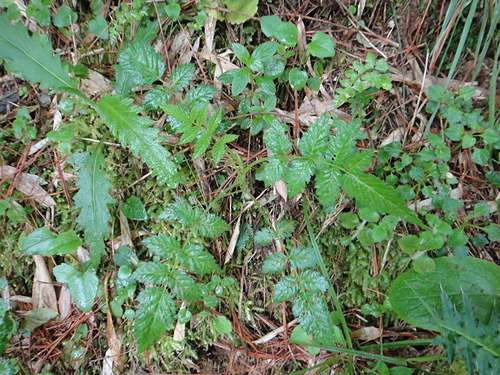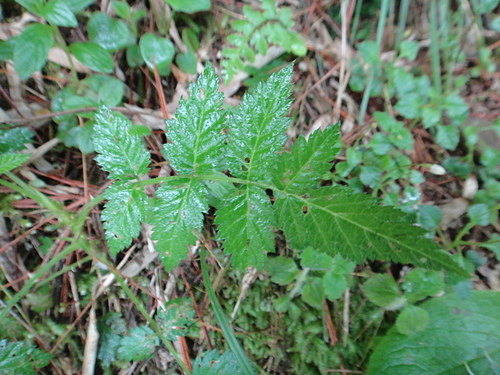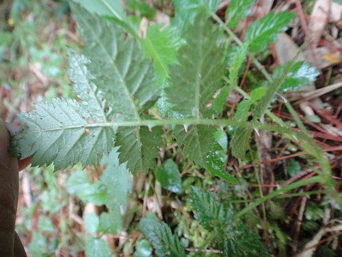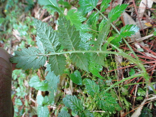 毛刺懸鉤子 多年生落葉蔓性灌木,攀附在其他樹種生長,莖散生棘刺,葉密生於枝條,5~7出羽狀複葉,頂生小葉長卵形鋸齒緣,花期6~8月,花單朵粉紅色,花萼筒狀,花萼5裂有紅刺,果實紅色球形漿果狀聚合果