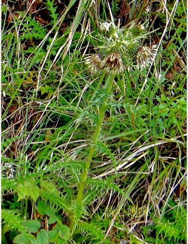 莖直立或斜上昇狀,上部分枝,高 80~120 公分,徑約 5~6 公分,上有柔絨毛,但無銳刺。葉為單葉互生,無葉柄,長 15~30 公分,寬 3~5 公分,先端銳尖、基部楔形、革質、邊緣呈羽狀深裂,缺刻成方框狀,每一裂片的先端呈細細尖尖木質的針狀物,邊緣具 1~2 公分長的刺;葉表面及背面都生有剛毛;表面呈有光澤的綠色,背面呈白粉狀。