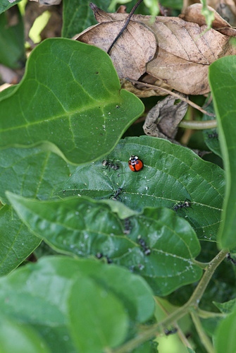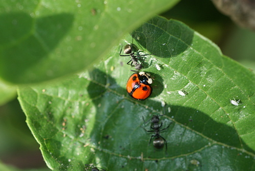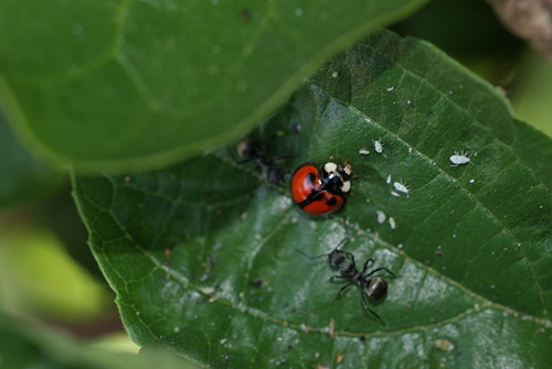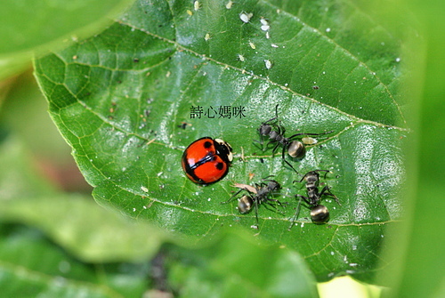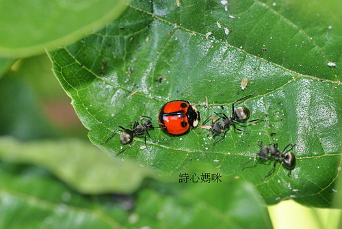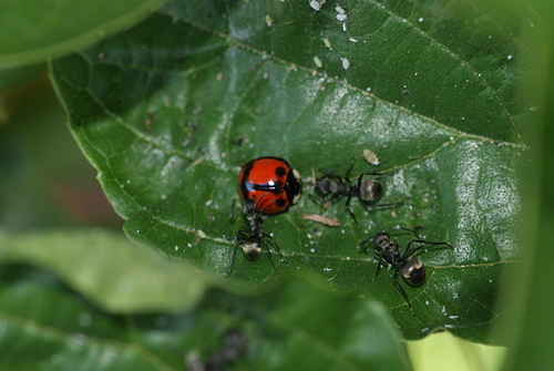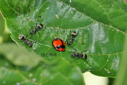 一隻錨紋瓢蟲(雄) 想吃朴樹蚜蟲,三隻黑棘蟻出動,合力驅趕牠,以保護能分泌蜜露食物的朴樹蚜蟲。