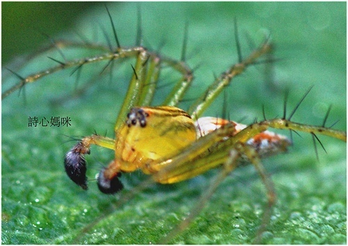 雄斜紋貓蛛的黑色觸肢膨大,好似戴著拳擊手套出征去~。
