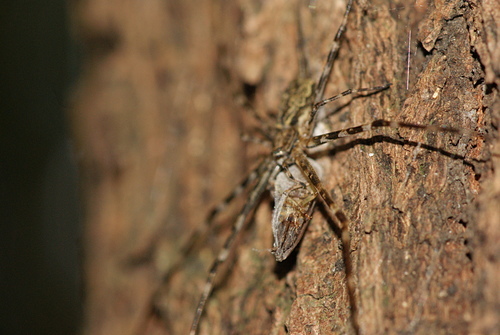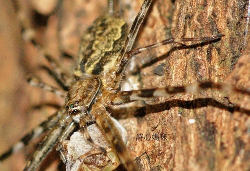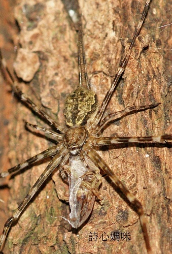 雌條紋長疣蛛(墨綠色) 再度補獲獵物 100.8.24 攝於 社區小公園 樟樹
