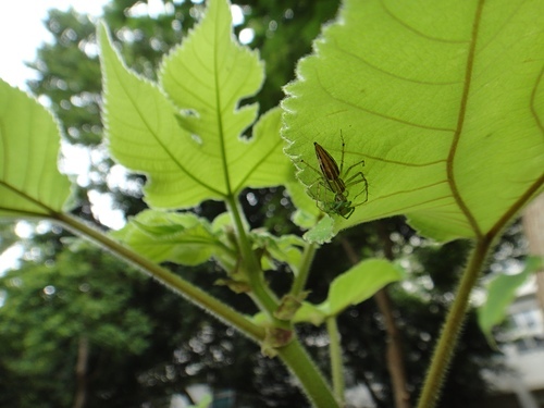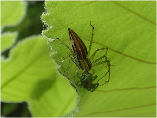 細紋貓蛛(條紋貓蛛)捕獲綠蜘蛛