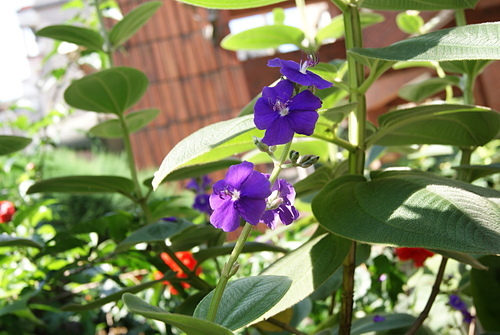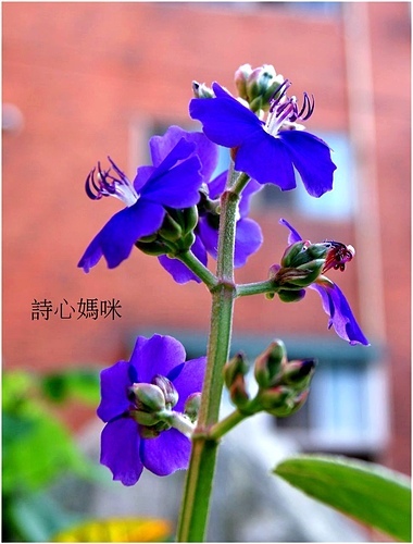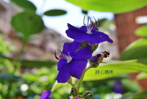 聚繖花序頂生,豔紫色,5~6 單瓣、具有深色放射斑條紋,花蕊紫紅色,花絲上段呈彎鉤狀;花瓣初開時豔紫色,後變為紫紅色。花期在 6~7 月。。