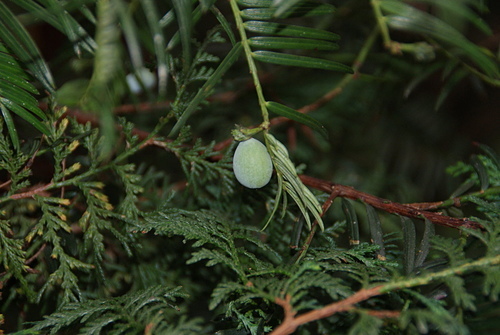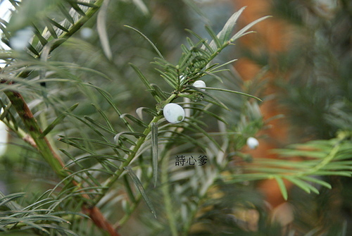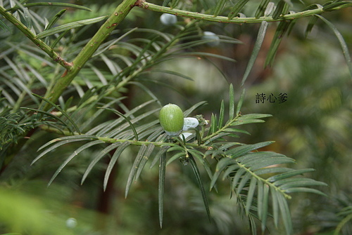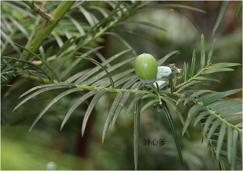 毬果與種子:種實橢圓形,成熟時呈暗紫色,種子卵形至倒卵形核果狀,近於無柄,由肉質假種皮包圍,授粉後於翌年10至11月成熟。