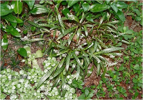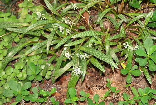 花白色,穗狀花序,花期春夏季,圓錐花序,小花綠色,約0.3公分,花瓣6枚,基部聚合呈鐘型,雄蕊為紫紅色。