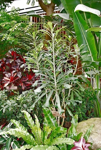 常綠小喬木,株高 2-4 公尺,全株枝葉光滑;枝幹直挺生長,嫩枝綠色,成熟枝灰色;枝條圓筒形,粗壯而帶肉質,無毛,具豐富乳汁,落葉後具明顯葉痕。葉互生,簇生枝端,戟形或匙形,長 20-30 公分,寬 2-5 公分,頂端短漸尖或突尖,基部狹楔形,全緣,薄革質;葉面深綠色,中脈凹陷;葉背淺綠色,中脈稍凸起;兩面均平滑無毛,僅葉背之中脈邊緣被柔毛;羽狀側脈 30-40 對,兩面扁平,近水平橫出,未達葉緣網結成邊脈;葉柄長 4-7 公分,上面基部具腺體,無毛;無托葉。