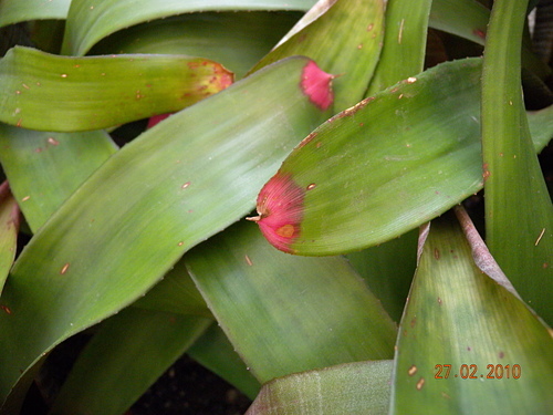 綠葉末端帶有紅色,乃其命名特徵。花為淡紫色。