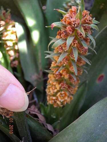 穗狀花序腋生,苞片顯著;花被片6,花黃色或淡黃色,肉質,合生,裂片短;雄蕊6,與花被筒聯生;子房上位,花柱1,不明顯,柱頭3裂。