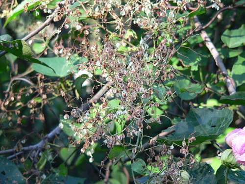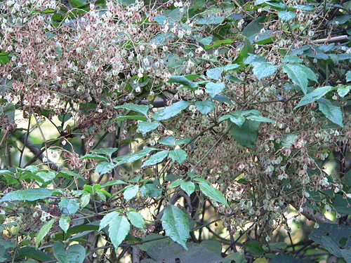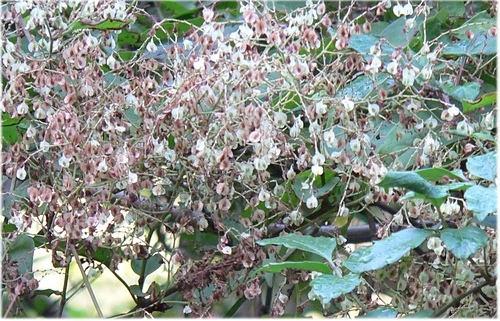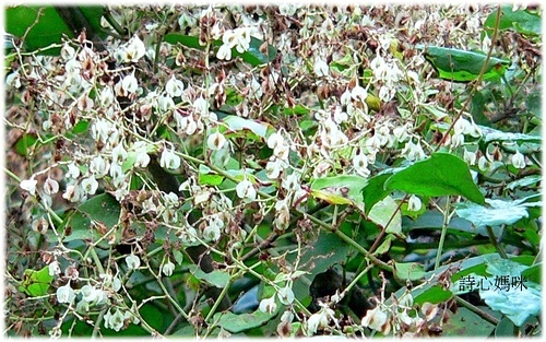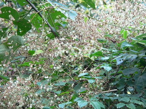 夏秋開花,總狀須花序,形成大圓錐狀腋生,著多數細小白花,花萼 5 深裂,缺花瓣;雄蕊 8 枚;子房卵形,具 3 裂花柱。夏末秋初,常攀爬覆蓋於其他植物體上,盛花期遠望猶似花樹簇簇,十分醒目。