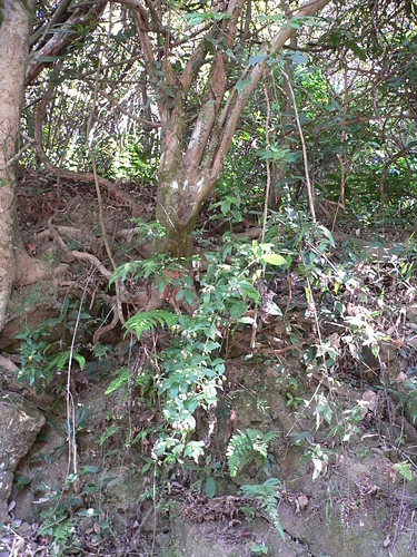 大頭艾納香 生長在低海拔向陽山坡、林緣之多年生小灌木或攀岩懸垂性蔓狀草本。枝條細長,蔓性,蔓狀莖平滑,有縱溝,之字形曲折。葉互生,微革質,長橢圓形,葉基楔形,柄短,葉面綠色,葉背蒼灰白色,兩面有微毛。