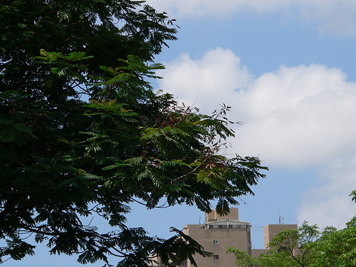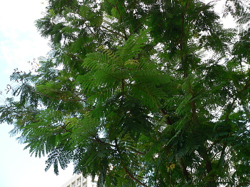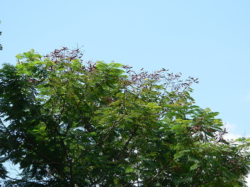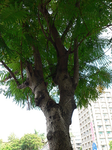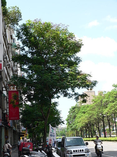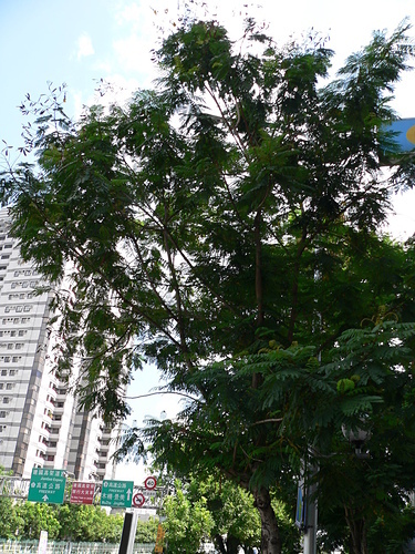 落葉大喬木,樹高可達 20 公尺以上,徑 30120 公分,樹幹通直,具有多數分枝;幼枝,花序及葉柄被有褐色毛茸;樹皮光滑,灰褐色,有明顯的皮孔。二回羽狀複葉,長 2040 公分,托葉小,線狀鑿形或羽狀裂,羽片 413 對,小葉 822 對,長橢圓形,長 12.4 公分,寬 0.40.9 公分,表裏兩面或僅背面有毛茸。