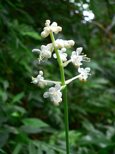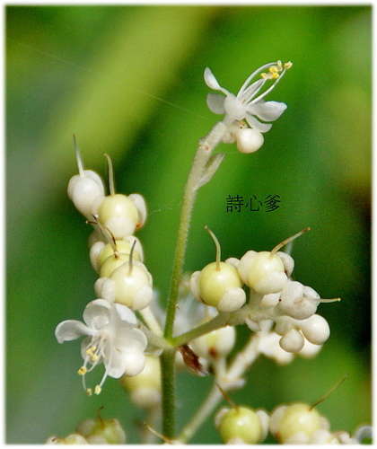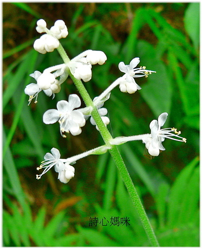 花排成聚繖狀圓錐花序,放射對稱,兩形;萼片離生;雄蕊6,全可孕或半數可孕;花柱光滑,白色花瓣3枚,離生,等大,花徑可達 5 公分;萼片 3 枚略似花瓣,但較短小。