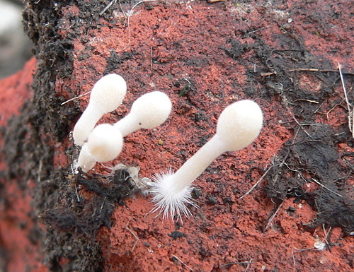 簇生類鬼傘的幼菌 紅磚塊上迷你白菇