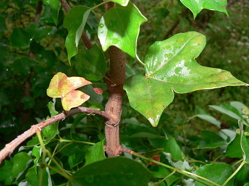 小枝光滑。葉常前半部三裂,偶不裂,革質,闊三角狀卵形或橢圓形,長2-6cm,寬1.5-7cm,基部圓或略心形。