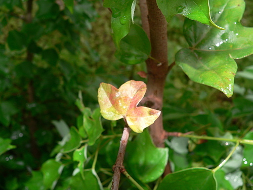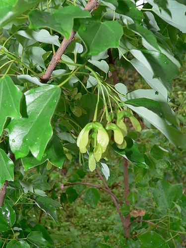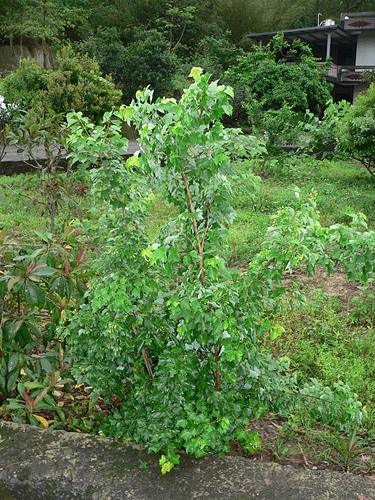 落葉喬木;樹高可達10m以上,枝條近於光滑。葉革質,掌狀三淺裂,對生,葉基呈圓形,葉背灰白,葉柄3~5cm,呈黃綠色,落葉變紅。