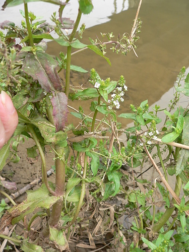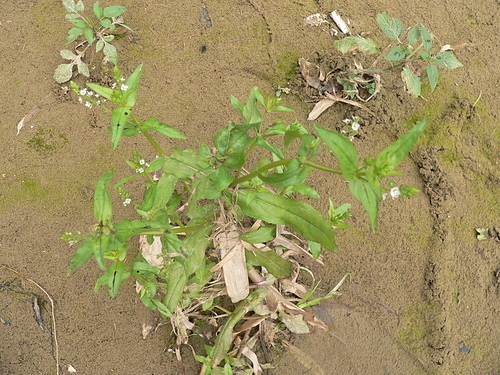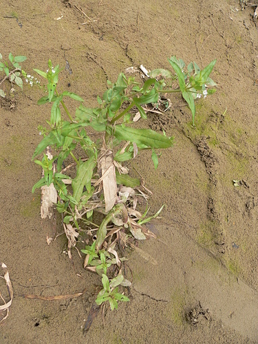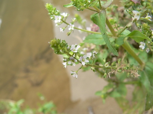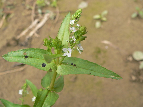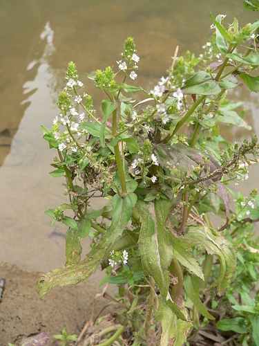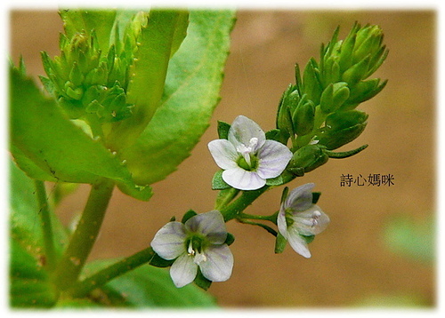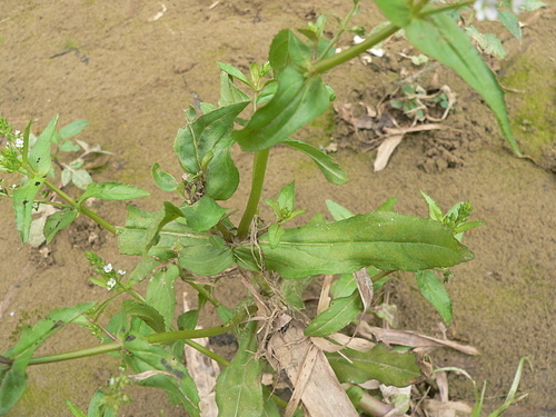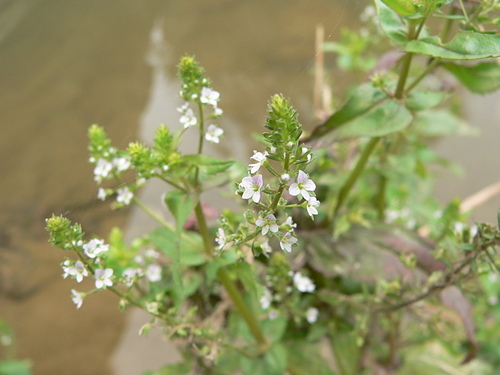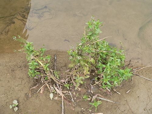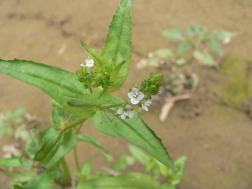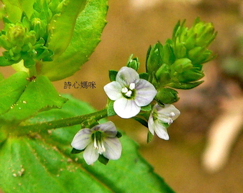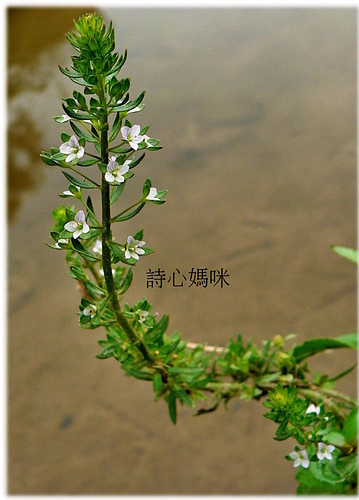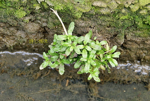 水苦蕒 一年生挺水或沉水草本,高5~30 cm。挺水葉長橢圓形,長3~8.5 cm,寬1.5~2.3 cm,無柄;沉水葉柔軟。總狀花序腋生,花冠4裂,白或淡紫色,雄花2枚。蒴果圓形,種子長橢圓形,褐色,長0.3 mm。