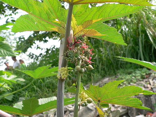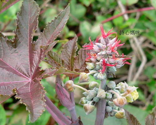 一年生灌木草本。葉掌狀深裂,互生,鋸齒緣,長柄柄端有腺體。莖直立,綠至紫色,有白粉。總狀花序,圓錐狀,雌花位於上方鮮紅色,雄花在下方淡黃色,花期整年。蒴果,表面有軟刺,種子咖啡色斑紋。