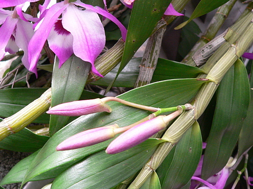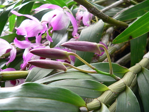 春石斛跟秋石斛的區別除了花期不同外,花莖長出的部位也不同,春石斛的花莖是從假球莖的節間長出,而秋石斛的花莖則是從植株的中心抽出。