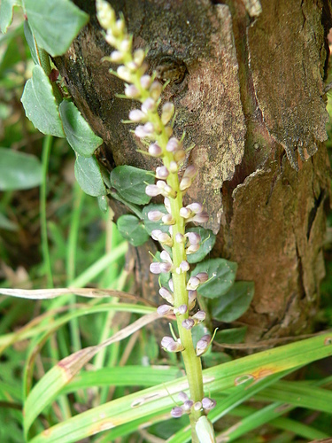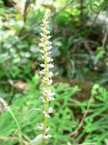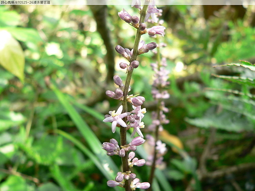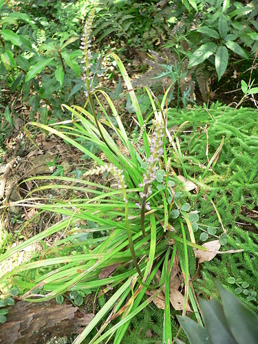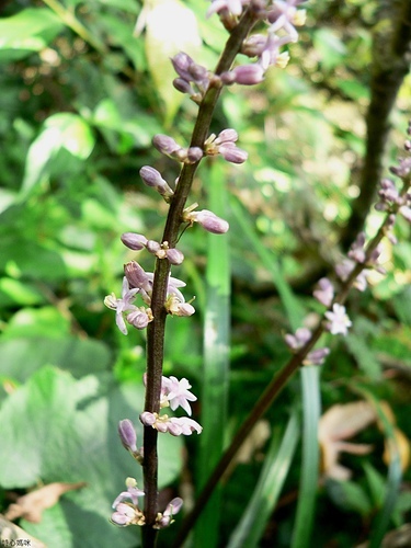 多年生草木,地下有許多走莖及紡錘根;葉叢生,細長而呈狹線形,長約 10-30 公分,寬約 0.2-0.3 公分,先端鈍,基部楔形,葉背綠白色。花期夏至秋季,花莖長約 8-18 公分,每一花莖上著生約 10 朵花,排列成疏總狀花序,花被淡紫色或近於白色,雄蕊 6 枚;自葉腋處抽梗。小花多數,小型略下垂。漿果球形,成熟時紫黑色。