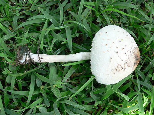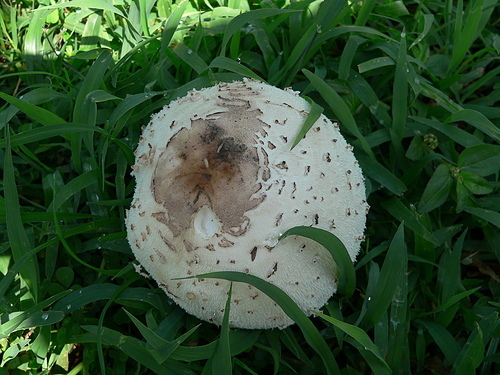 中型至大型菇菌。菌蓋初為半球形,後平展,成熟時,褐色表皮裂開,除中央較密集,餘皆成斑點狀分散,並露出海綿質菌肉。菌褶初白色,後呈淡黃綠色,傷後變褐色;具淡黃綠色是本菌與可食用之雨傘菇(Macrolepiotaprocera)區別之重要特徵。