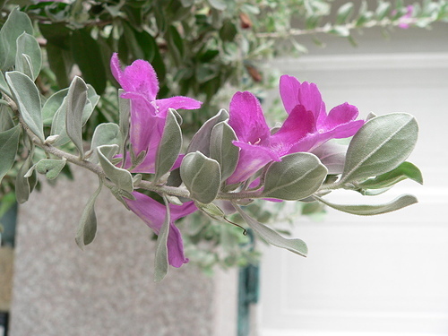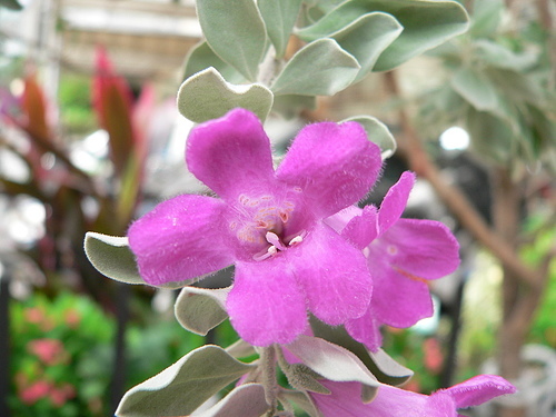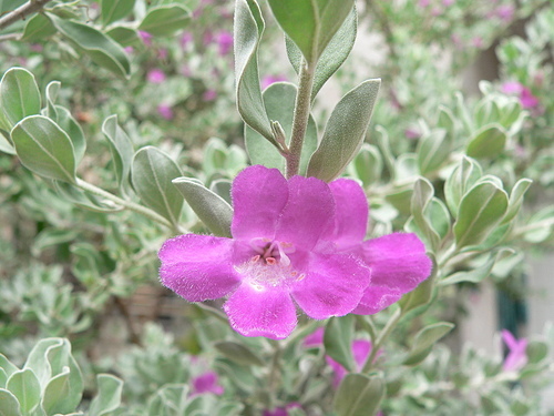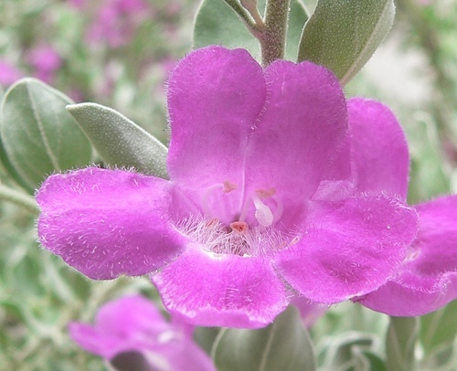 紅花玉芙蓉,學名 Leucophyllum frutescens,英文名 Texas Sage。玄參科,常綠小灌木,原產北美。株高 40-80 公分,葉互生,橢圓形或倒卵形,密被銀白色毛茸。花腋生,花冠鈴形,紫紅色,花期夏至秋季。葉色獨特,花期長,為庭園美化、低籬或盆栽之優雅矮灌木。