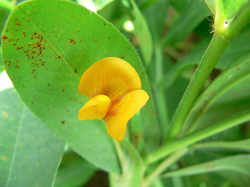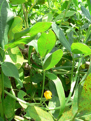 一年生草本,高25~50cm,被毛,分枝多。根部有豐富的根瘤。莖臥地或直立,有棕色長柔毛。葉為偶數羽狀複葉,長8~12cm,葉柄基部抱莖;托葉披針形;小葉4枚,矩口形至倒卵形,長2.5~5cm,寬1.5~3cm,先端鈍或有細突尖,基部狹,全緣,兩面無毛。花黃色,單生或簇生於葉腋;花梗長約8mm;不孕花很快凋謝,能育花的萼管線形,裂片摸質,上4枚合生,下1枚分高,成2唇形;花冠蝶形,旗瓣近圓形,寬大,翼瓣與龍骨辨分離,其瓣矩口形,龍骨瓣內彎,有喙;雄蕊9,合生,1個退化,花藥5個矩圓形,4個近圓形,基著或丁字著生;花柱細長,柱頭頂生,甚小,疏生細毛,子房近無柄,生管基部;胚珠1~4顆,胚珠受精後,子房柄伸長至地下,膨大成熟為莢果。莢果長橢圓形,果皮厚,谷黃色,革質,具突起網脈,長4~5cm,不開裂,內含種子1~4粒,種皮紅色或黃紅色,種子白色。花期6~7月,果期9~10月。