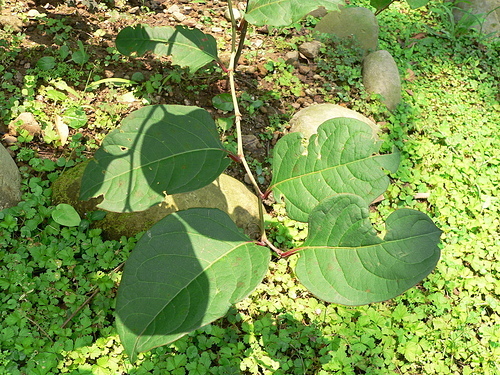 葉為卵形或闊卵形,互生,長 6~15 公分,寬 4~6 公分,先端尖銳,基部圓,呈截斷狀或楔形,邊緣無鋸齒或淺波浪狀,光滑,但葉脈上有毛;葉柄長 1~2 公分,鞘苞長 0.4~0.6 公分,膜質。