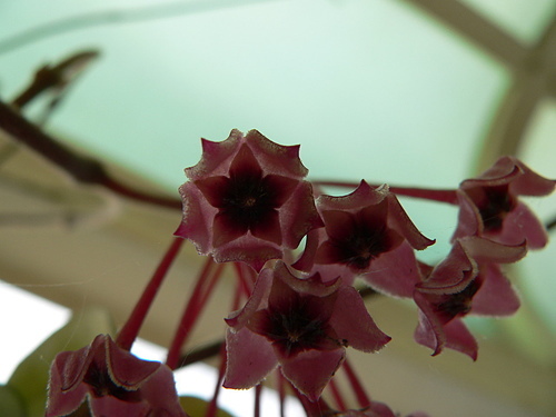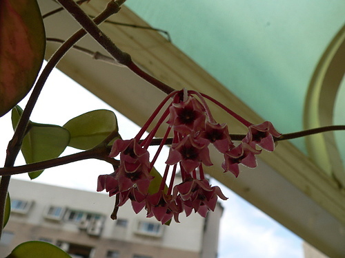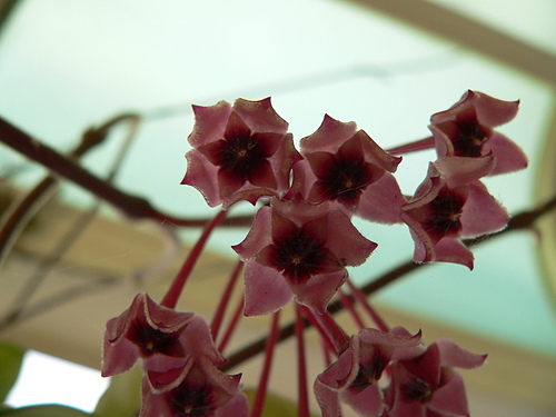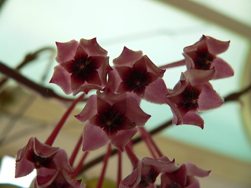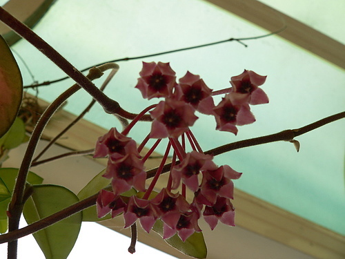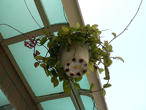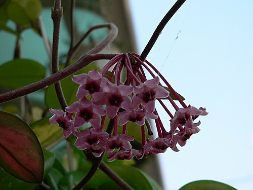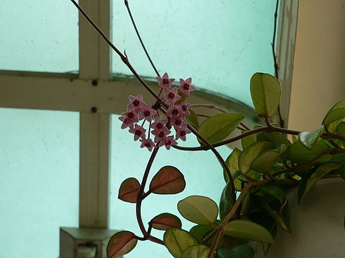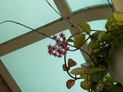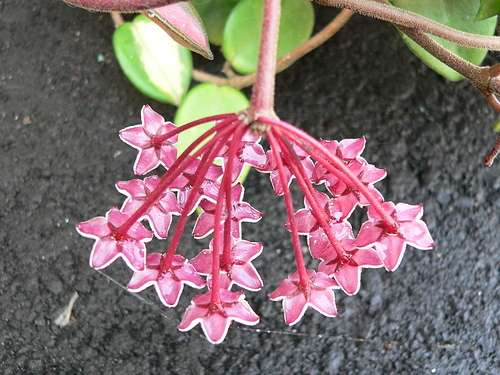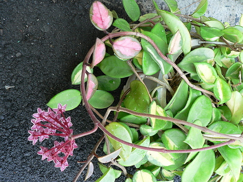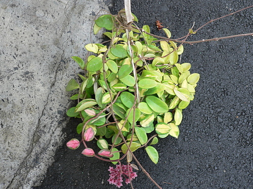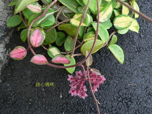 型態 : 細長的蔓莖具氣根且能攀爬支柱或牆面,尖卵形的葉片呈厚肉質狀,葉色為乳綠色葉面上夾雜白色、淺黃色的斑塊,開花時像一把仙女棒似的繖形花序,10~15朵花聚生於花莖頂端,各朵小花為粉紅色呈五角星形,花瓣厚且蠟質狀,具香氣。