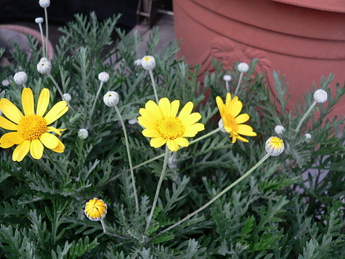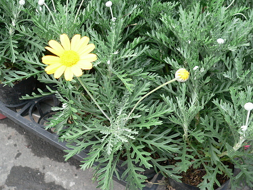 花朵形似俗稱「瑪格麗特」的木春菊,不過葉片形狀是美麗的羽狀缺刻,而且全株覆有銀灰色的絨毛可以區別。
