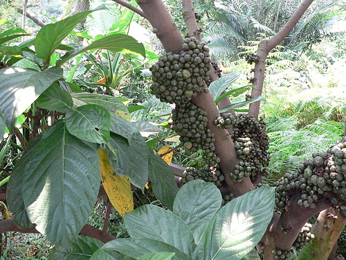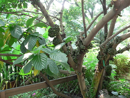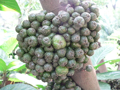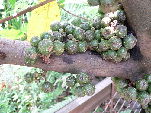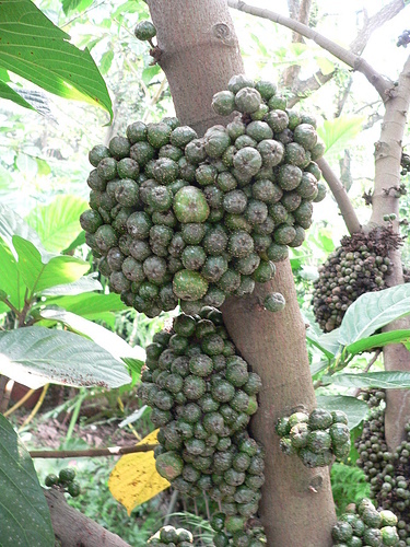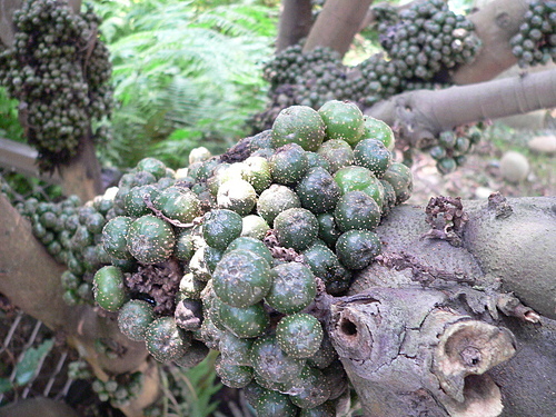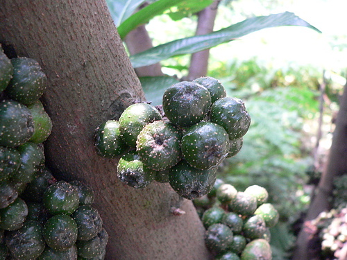 果實內生小花,花被片為紫紅色。隱花果腋生,卵形或球形,內有柔毛或無毛。熟果呈橙紅、紅棕或茶褐色,光滑或有散生茸毛,常帶有白斑,密生於樹幹基部,或分散在枝條,熟時橙紅色。