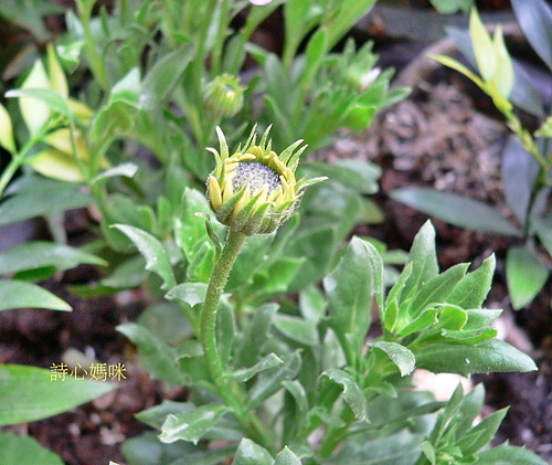 藍眼菊的管狀花尚未開放時,是汎著金屬光澤的藍紫色梅花造型
