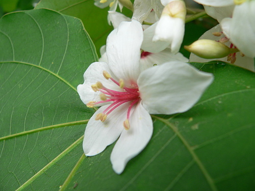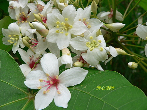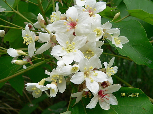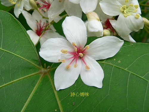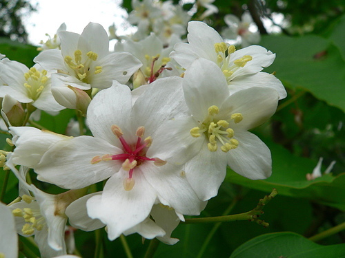 多數雌雄異株,總狀花序頂生,花冠白色,倒卵形,五瓣,基部略紅,長 2~3 公分;雄蕊 8~12 枚;子房 3~5 室;盛開時猶如白雪覆於其上,甚為美麗。初春至夏季 3-5 月開花。
