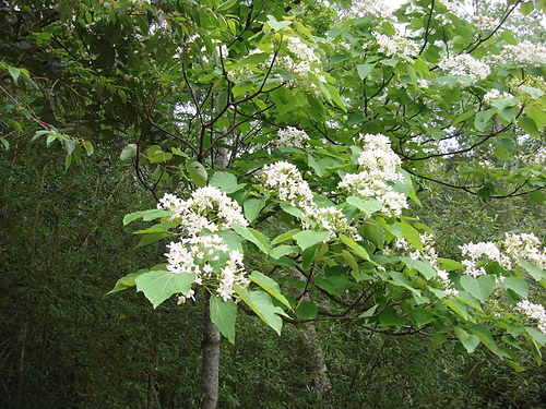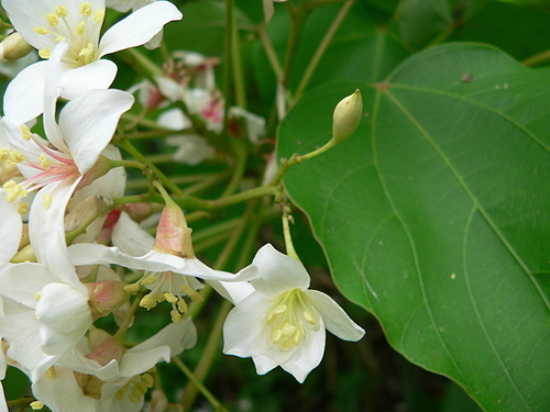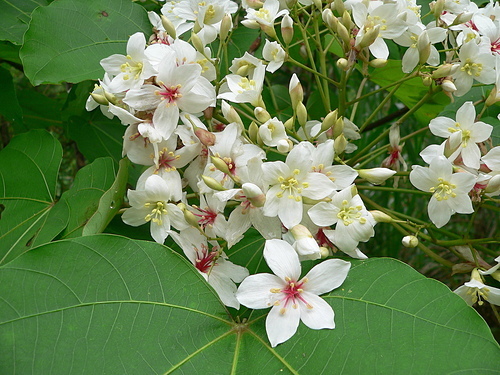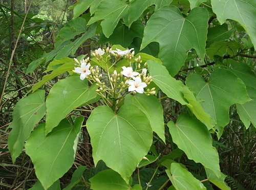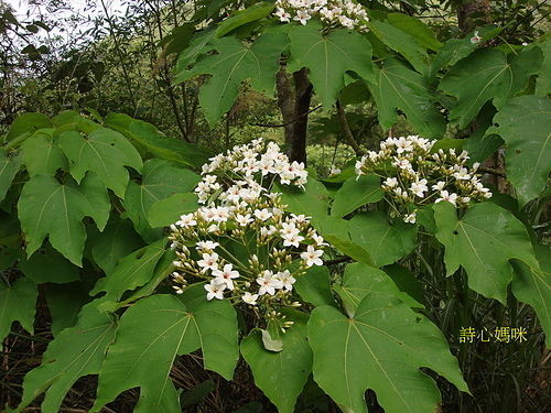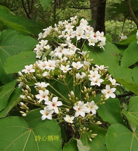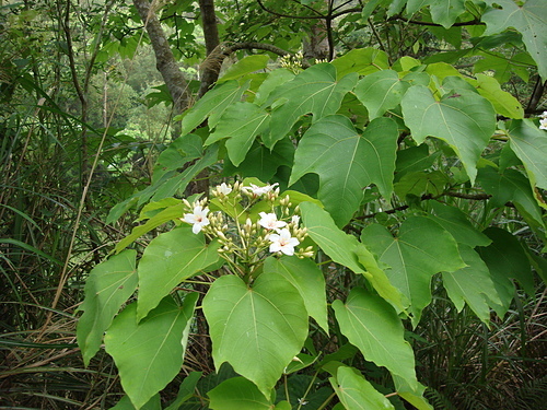 千年桐 為大戟科落葉喬木,株高可達 20 公尺,小枝平滑無毛。葉互生,具長柄,闊心臟形,常 3~5 深裂或全緣,深裂處各有一小腺體,葉基部之二杯狀而具柄之腺體,可泌液引誘重蟻吸食。