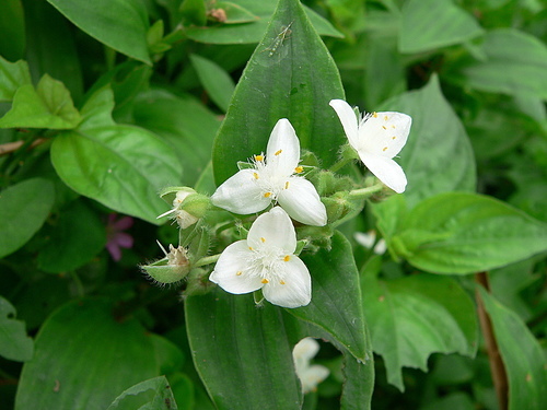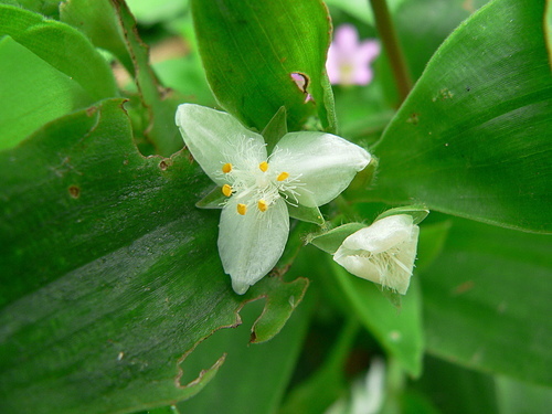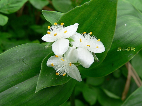 三瓣白色花朵,六黃蕊(雄),一白蕊(雌);花朵具密集細白絲。綠花萼三角尖狀。花開凋萎後,會捲縮入花萼中。