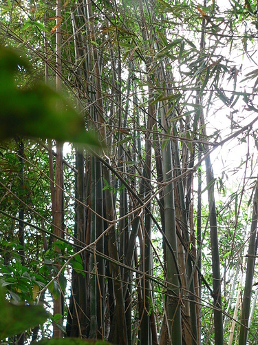 刺竹高大、竹桿密集叢生的竹子,竹桿基部的小枝條會變成刺,因此得名。它的根莖錯綜,莖肉甚後,六至八月間生筍,籜黃色,上有深紫色的毛。