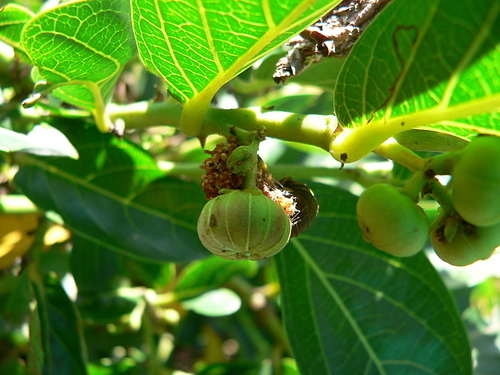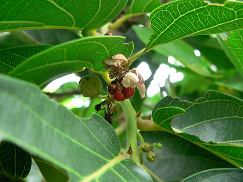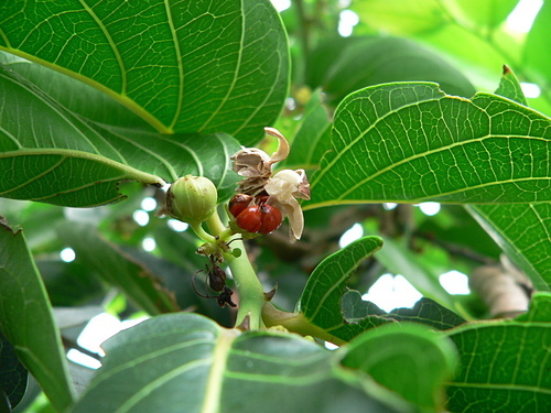 蒴果似包子形狀,成熟後開裂露出紅色種子。