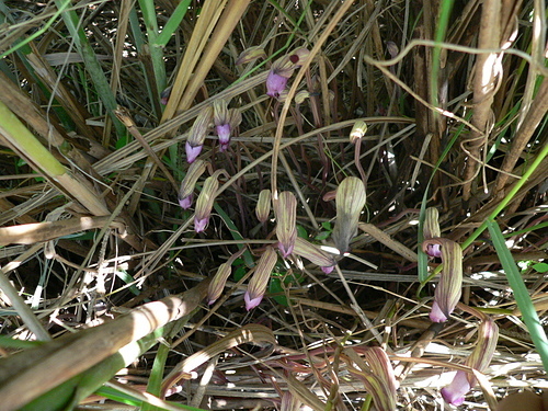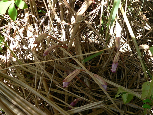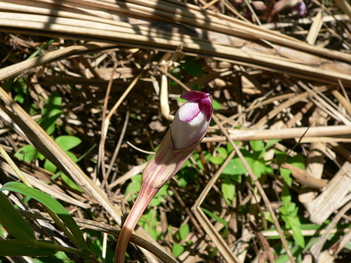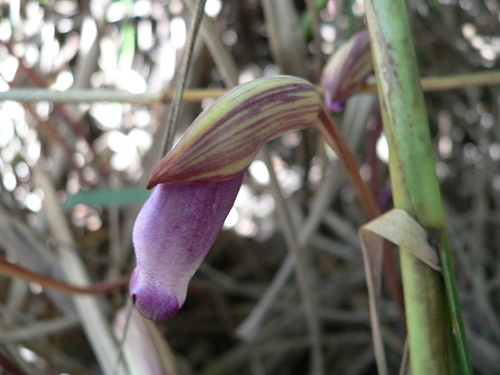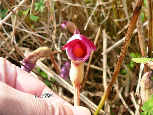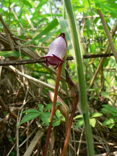 莖基部分枝,地上不分枝。葉退化成鱗片狀,全株肉色。枝頂開花,萼佛焰苞狀,冠二脣形,紫紅色,黃白色。