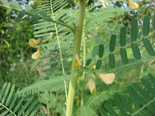 花:腋生,總狀花序、花冠蝶形,黃色,萼鐘形。