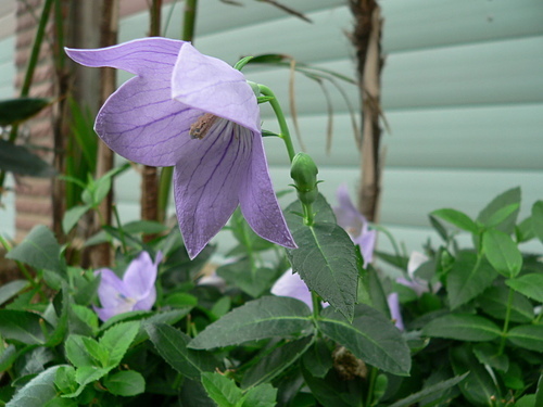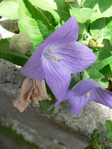 花頂生或單生腋出,呈鐘狀,先端5裂,呈星形合瓣花,為藍色或白色,花萼5枚,呈披針形,花柱5裂,子房下位。