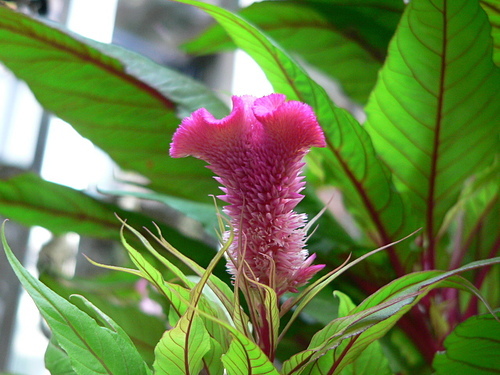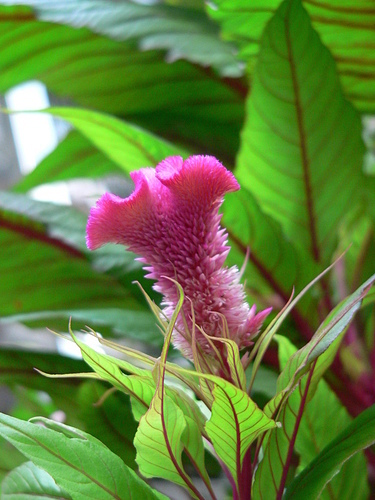 頭狀雞冠花為1年生的草本植物,植株的高度,會因品種而有所差別,通常約在30至100公分間。全株光滑無毛。葉互生,呈卵狀披針形。雞冠花花序屬於穗狀花序,如同稻子一樣,開在各分枝的頂端,看起來宛如公雞艷紅的雞冠。不過可不要誤以為這個雞冠是一朵花哦!其實它是由許多小花所構成的,因為這些小花都擁有乾膜質的花被,可以維持雞冠花的花期,所以雞冠花又被稱為「不凋花」,每朵小花內部都能夠產生黑色的種子。