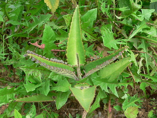 具葉柄,葉片綠色,葉片及葉柄上皆有褐色斑點,葉緣鋸齒狀,在缺刻處常生成不定芽。