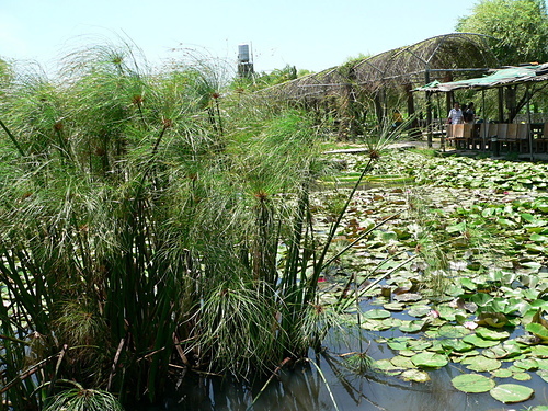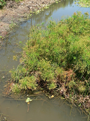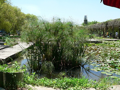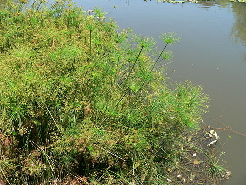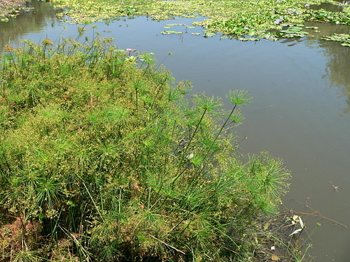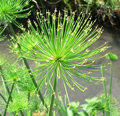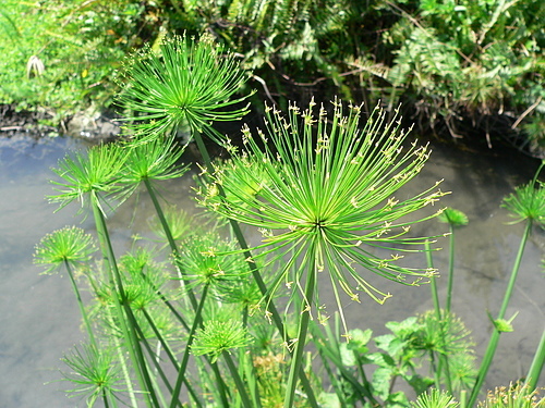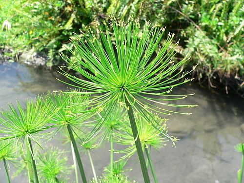紙莎草(Cyperus papyrus),英文名為Bulrush或Paper reed,又稱紙草、埃及莎草、埃及紙草。植物還年幼的時候,這簇葉子的生長型態就像雞毛撢一樣。花是綠褐色,生長在葉簇的末端。果實呈褐色。 地下莖在剛長出時會被一層紅褐色的紙質層覆蓋,這層三角形的鱗狀層也覆蓋了莖的基部。