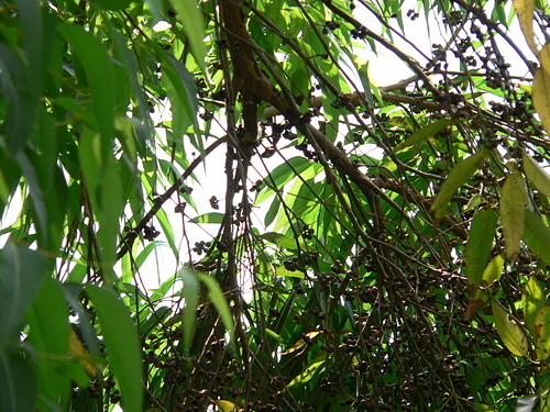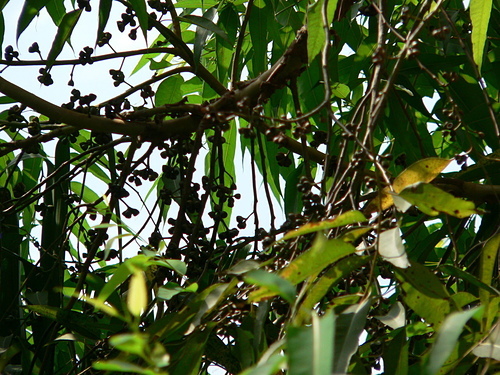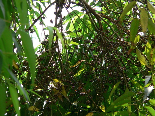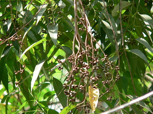 尤加利朔果成熟時,頂端的蒴蓋開裂。猶記兒時辦家家酒,會撿拾許多掉落地面的蒴蓋,再用針線將蒴蓋當作珠子,串成項鍊佩帶。幼童的想像力實在迷人!