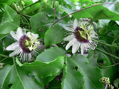 習性:百香果是多年生蔓性藤本的植物,在葉腋的地方會長出綠色的卷鬚,這綠色卷鬚是攀爬的工具。另外葉子有一個很奇怪的現象,那就是剛長出來的葉子是橢圓形的,但當葉子慢慢長大成老葉後會變成掌狀(三裂),花單生於葉 腋而且有香味,那圓形的花朵看起像太陽的臉譜,而那絲狀的花瓣看起來就像太陽射出來的光芒。