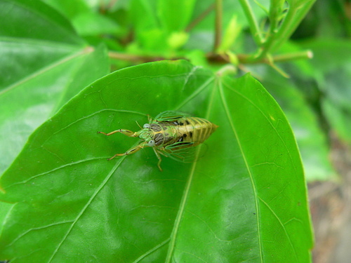 96.6.3 週日上午,外子騎機車載我與小女兒,欲到社區散步道旁果園拍芒果與蓮霧,巧遇知了在朱槿葉片上大聲鳴唱。尖銳的叫聲,吸引我們循聲前往一窺其貌。竟然是美麗的綠色型草蟬啊!