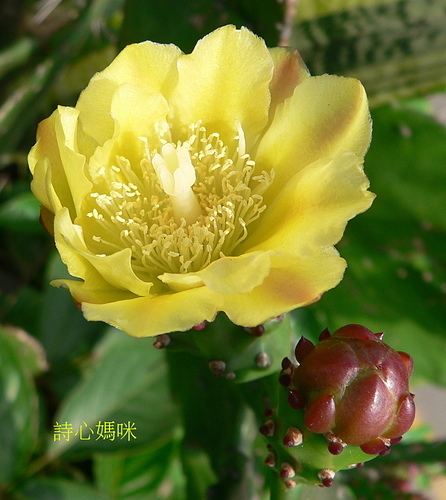 別名:平安刺 多年生多肉草本。莖呈節狀,每節如倒卵形,扁平、肉質多汁,老莖呈木質化。刺狀葉,白色,長約1cm。 花頂生,鮮黃色。 果實為漿果。 可供觀賞,可做綠籬,漿果可以吃,全株可藥用。 (參考 金武扇仙人掌 )