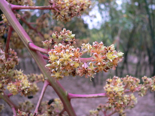 圓錐花序頂生枝端,被柔毛。花瓣5枚,淡黃色。花盤肉質。