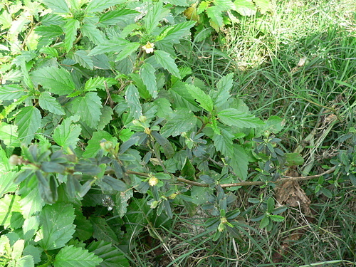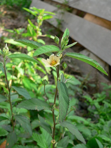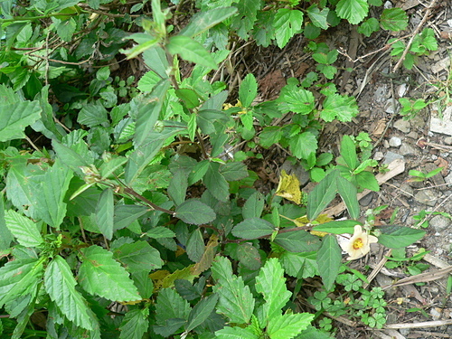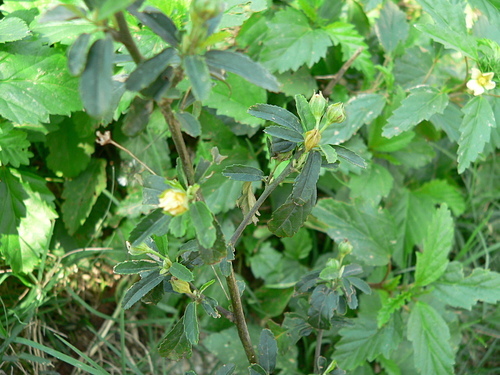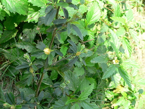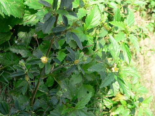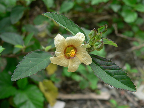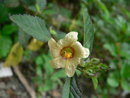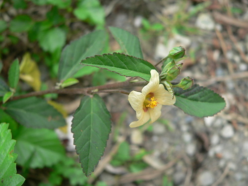 又稱黃花稔,葉子互生,葉片為長披針. 形,邊緣稍有鋸齒狀。花朵數量很多,. 每日清晨綻放,接近中午時完全盛開,過午後便凋謝,花朵只有半天的壽命。所以有金午時花之稱。