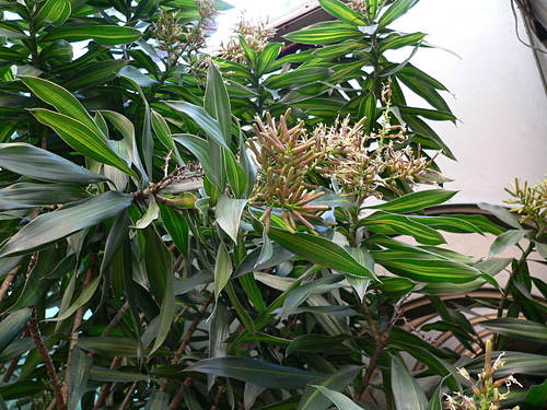 常綠灌木,幹直立,株高可達2公尺,成株莖幹易彎曲傾斜。葉劍狀披針形,無柄,革質,常叢生於枝端,葉色翠綠富光澤,葉緣深綠色,葉片中間金黃色。