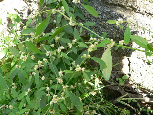 花白色,密集成圓球形的穗狀花序,不具柄,腋出。
